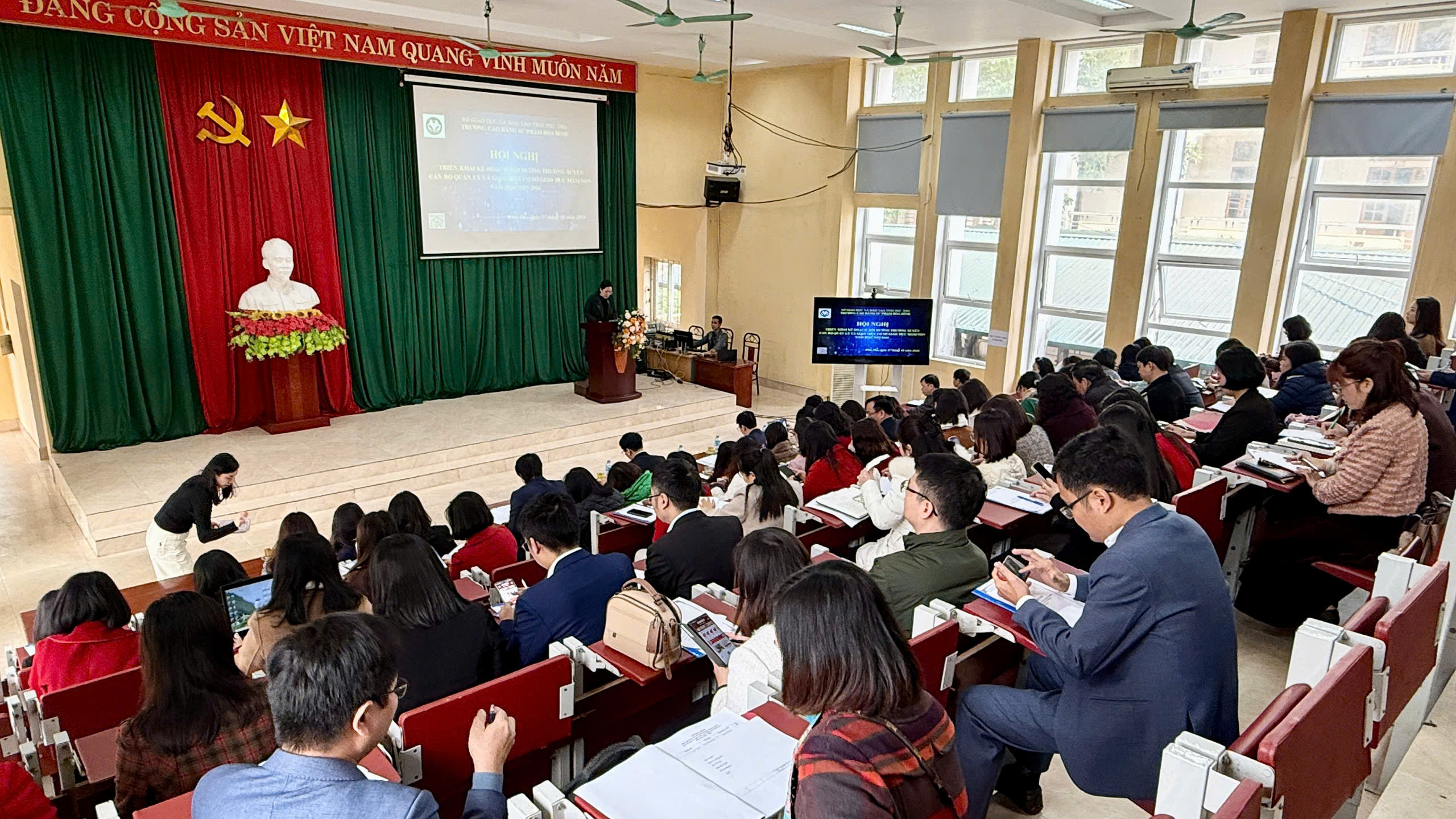 Tại Hội nghị, các đại biểu đã được nghe nhà giáo Nguyễn Thị Lệ Hường, Hiệu trưởng trường Cao đẳng Sư phạm Hoà Bình trình bày chi tiết về nội dung bao gồm: đối tượng, số lượng học viên tham gia bồi dưỡng, nội dung bồi dưỡng, kế hoạch triển khai gồm: hình thức và thời gian bồi dưỡng cụ thể của đợt BDTX năm học 2025-2026, thành phần báo cáo viên và các công tác chuẩn bị cho đợt BDTX.