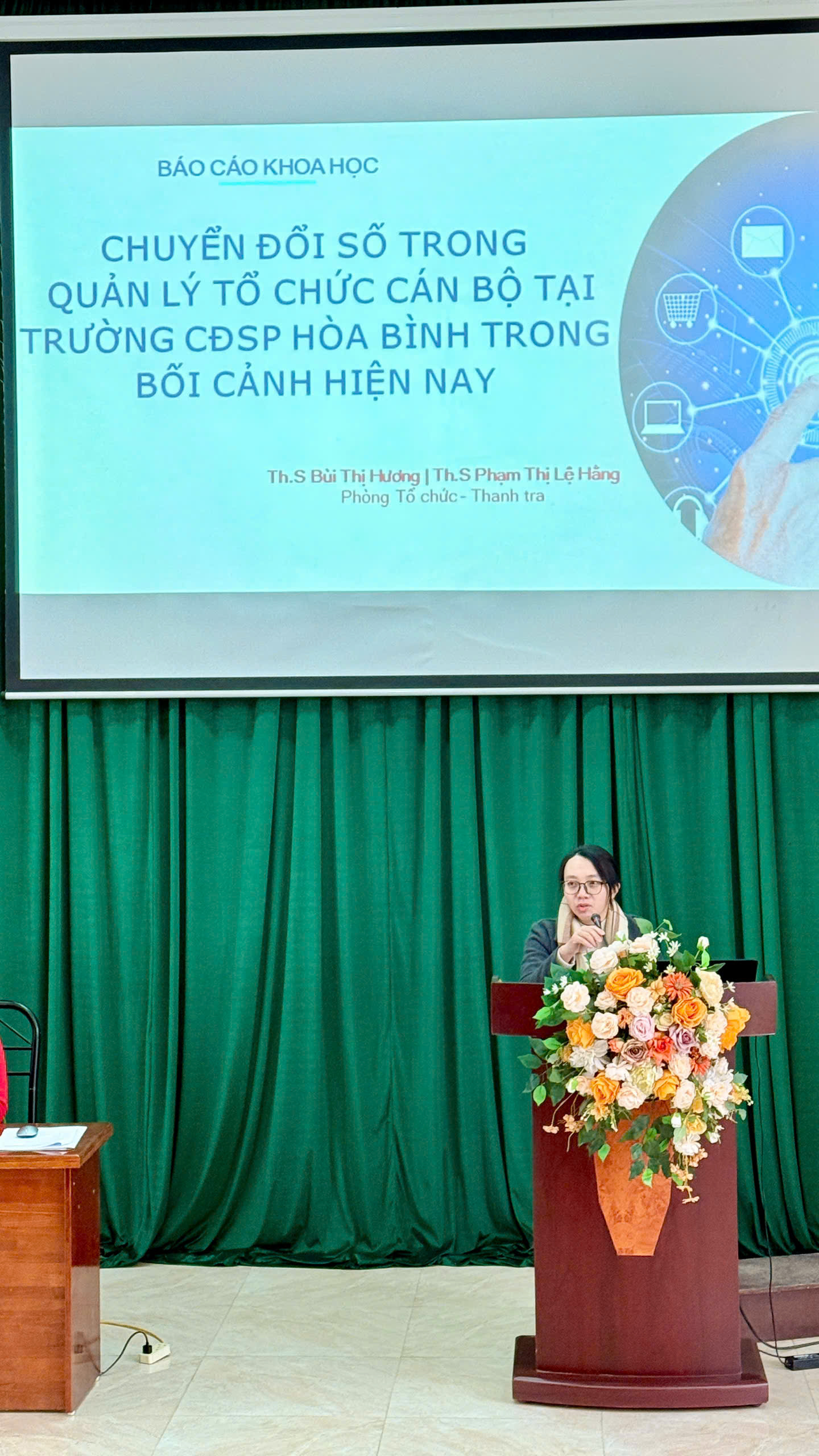 Báo cáo số 02: “Chuyển đổi số trong quản lý tổ chức cán bộ tại Trường Cao đẳng Sư phạm Hòa Bình trong bối cảnh hiện nay” do Th.S Phạm Thị Lệ Hằng – Phòng Tổ chức – Thanh tra trình bày, nhấn mạnh vai trò của chuyển đổi số trong công tác quản lý nhân sự, xây dựng đội ngũ đáp ứng yêu cầu đổi mới giáo dục.
