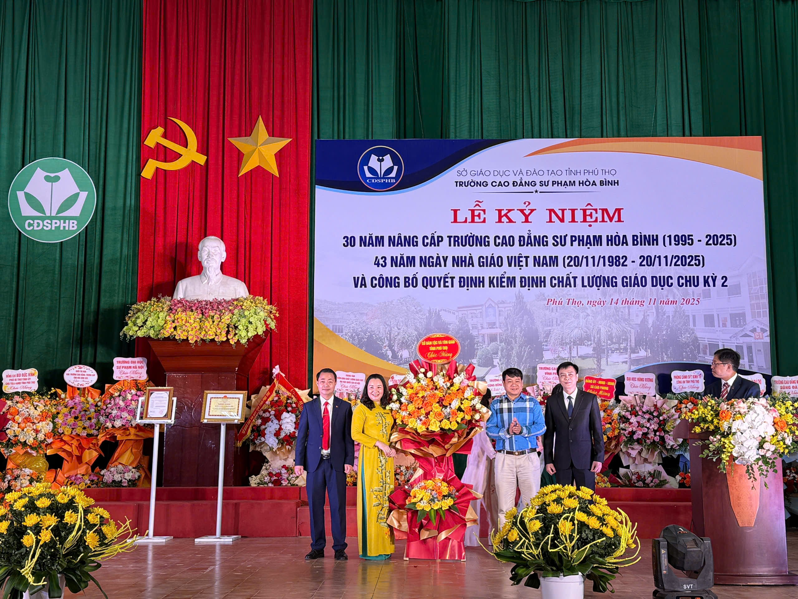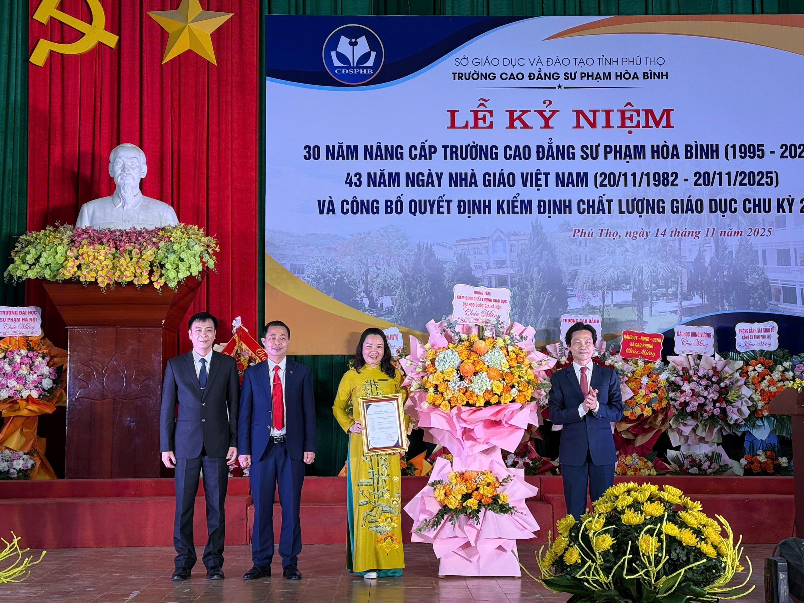 Lãnh đạo Trung tâm kiểm định chất lượng (Đại học Quốc gia Hà Nội) trao Chứng nhận kiểm định chất lượng giáo dục chu kỳ 2 và tặng hoa chúc mừng Trường Cao đẳng Sư phạm Hòa Bình