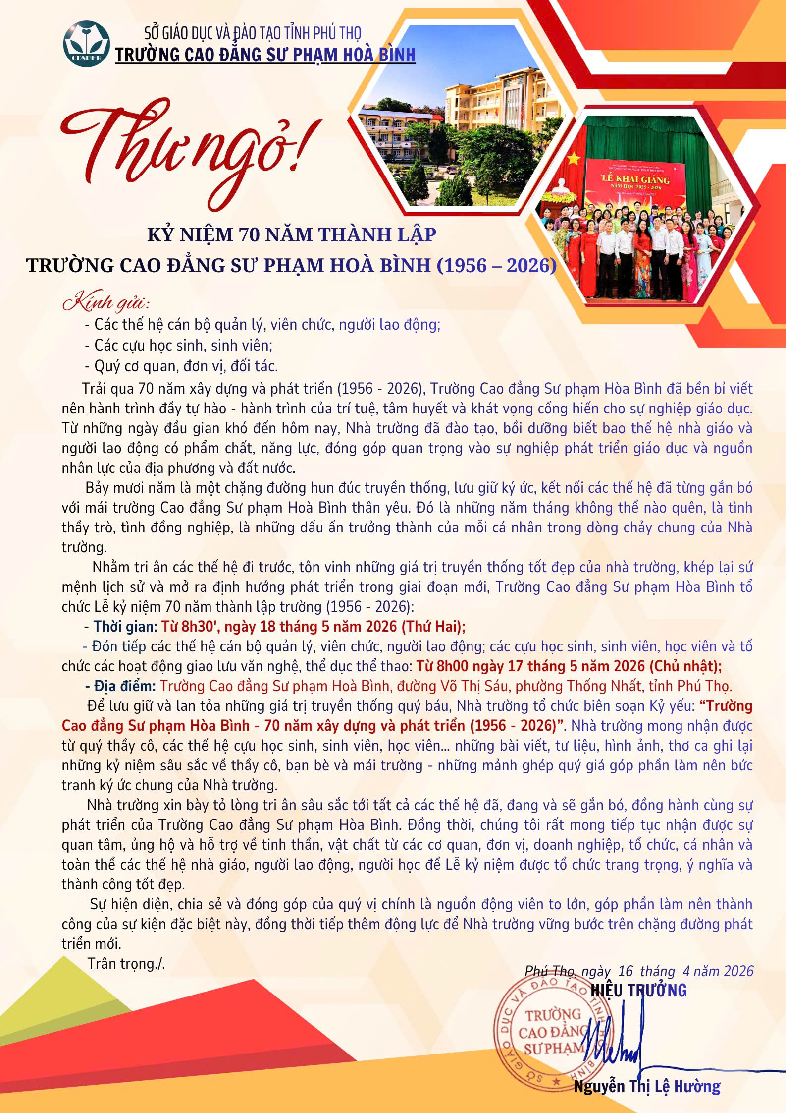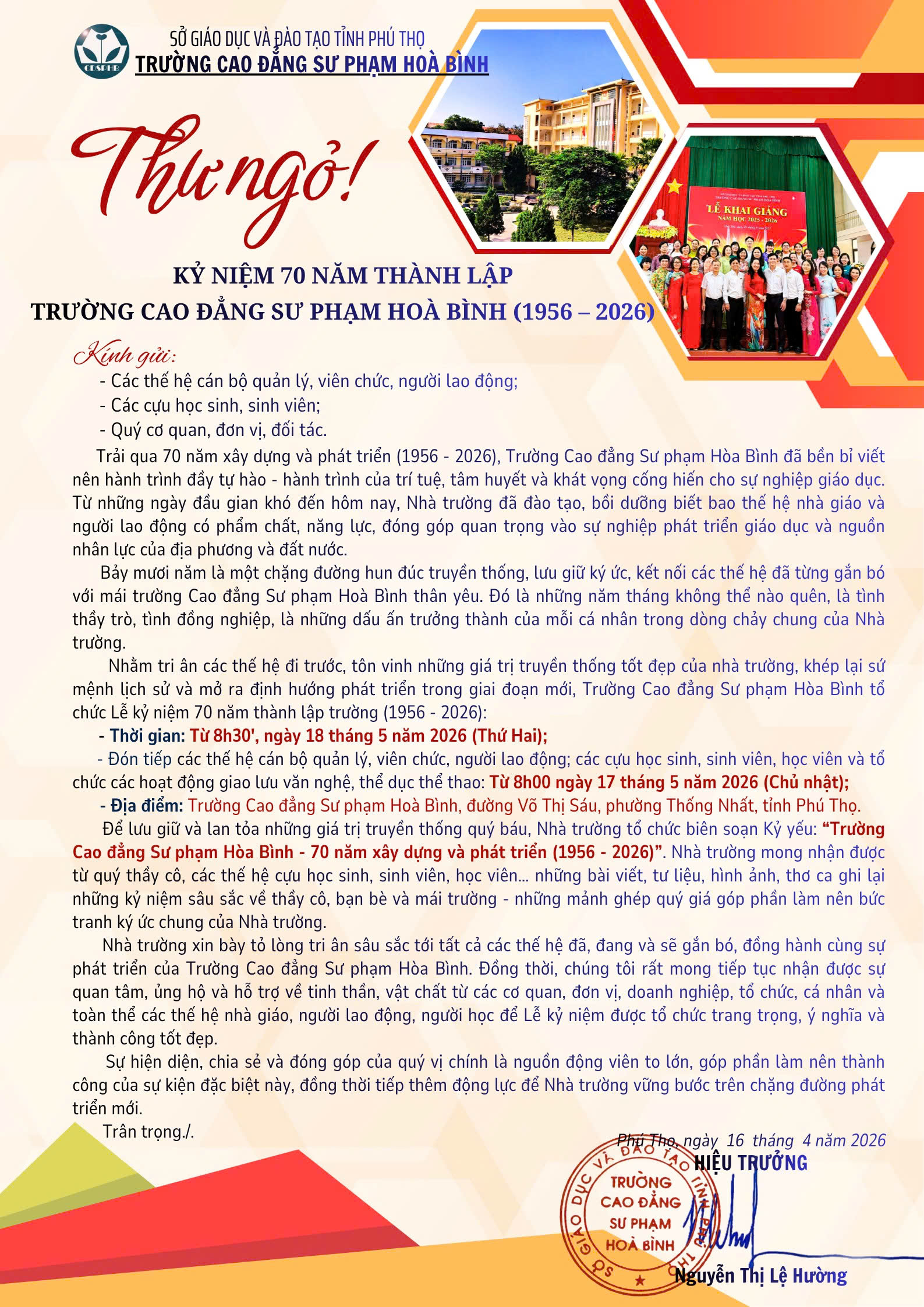 Thư ngỏ kỷ niệm 70 năm thành lập trường Cao đẳng Sư phạm Hòa Bình Featured